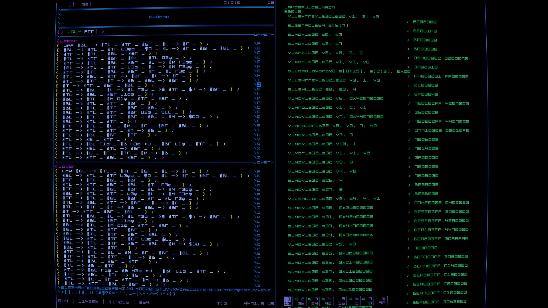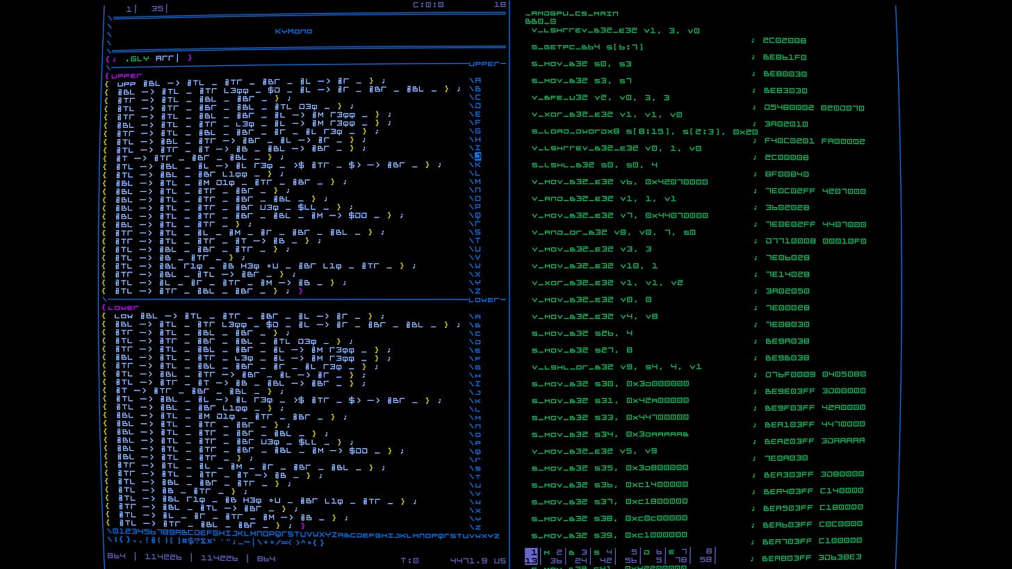 Onat has a website an article on KYRA. We immediately learn that its a “concatenative language” derived from offshoots of FORTH. Particularly Moore’s own colorFORTH along with taking heavy inspiration from Timothy Lottes’s custom compiled Forth-like he worked on throughout the late 2000s up to 2016 at least (his blog is dead and the only archive of it is a github repo).
